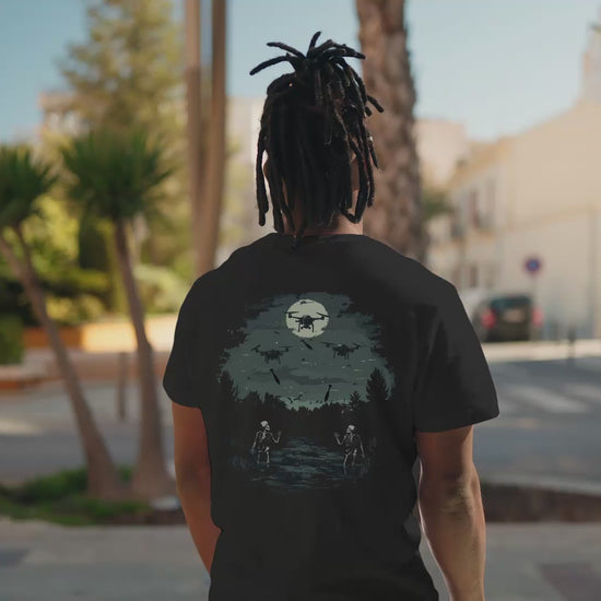 Das "Drone Strike" T-Shirt ist mehr als nur ein Kleidungsstück – es ist ein Statement. Auf der Brust prangt ein einzigartiger, detailreicher Druck, der eine Drohne zeigt, die Handgranaten abwirft. Das Design kombiniert urbanen Stil mit einem Hauch von Provokation, ideal für alle, die gerne ein Zeichen setzen und sich vom Mainstream abheben.